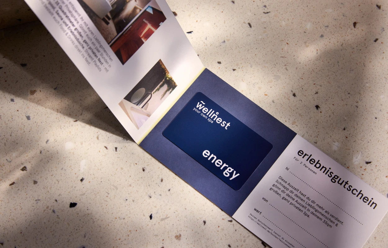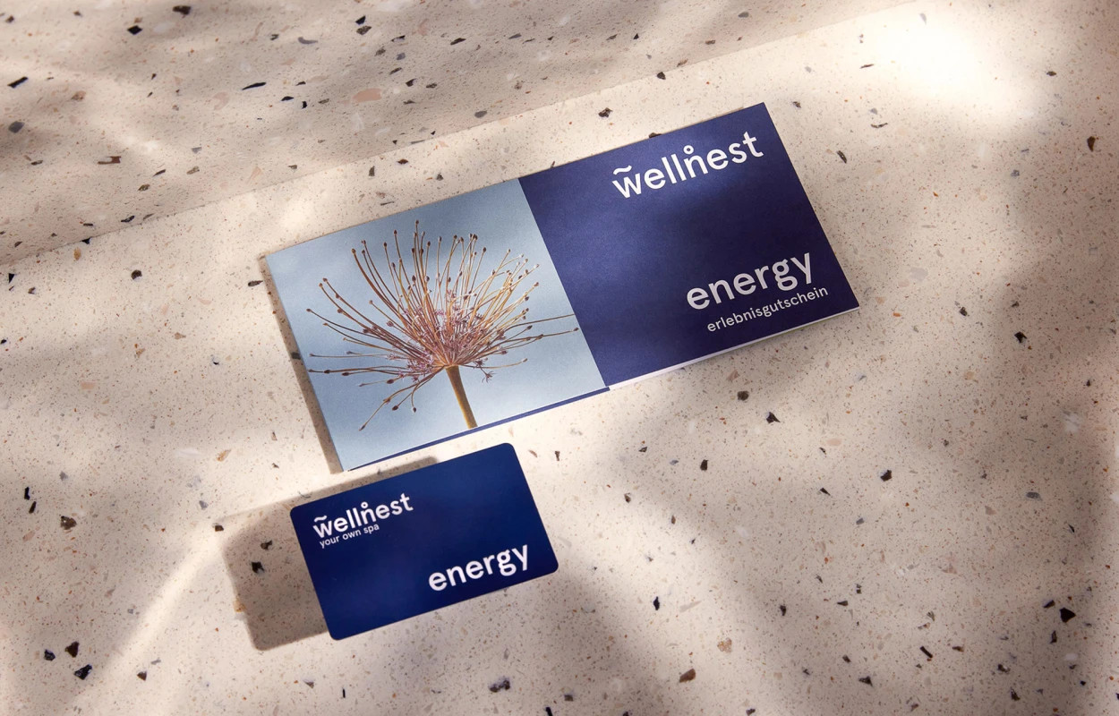 Tankt neue Energie - Mit diesem Erlebnisgutschein für eine Auszeit im energy-vibe schenkst du deinen Liebsten echte Vorfreude und ein unvergessliches wellnest-Erlebnis mit frischen Ingwer Drinks, einer aquatischen Duftstimmung & vielem mehr. Mit unserem Erlebnisgutschein kann der oder die Beschenkte auf wellnest.me und in allen wellnest Filialen sein Nest buchen. Du kannst zwischen einer Geschenkkarte und einem digitalen Gutschein (als PDF per E-Mail) wählen.