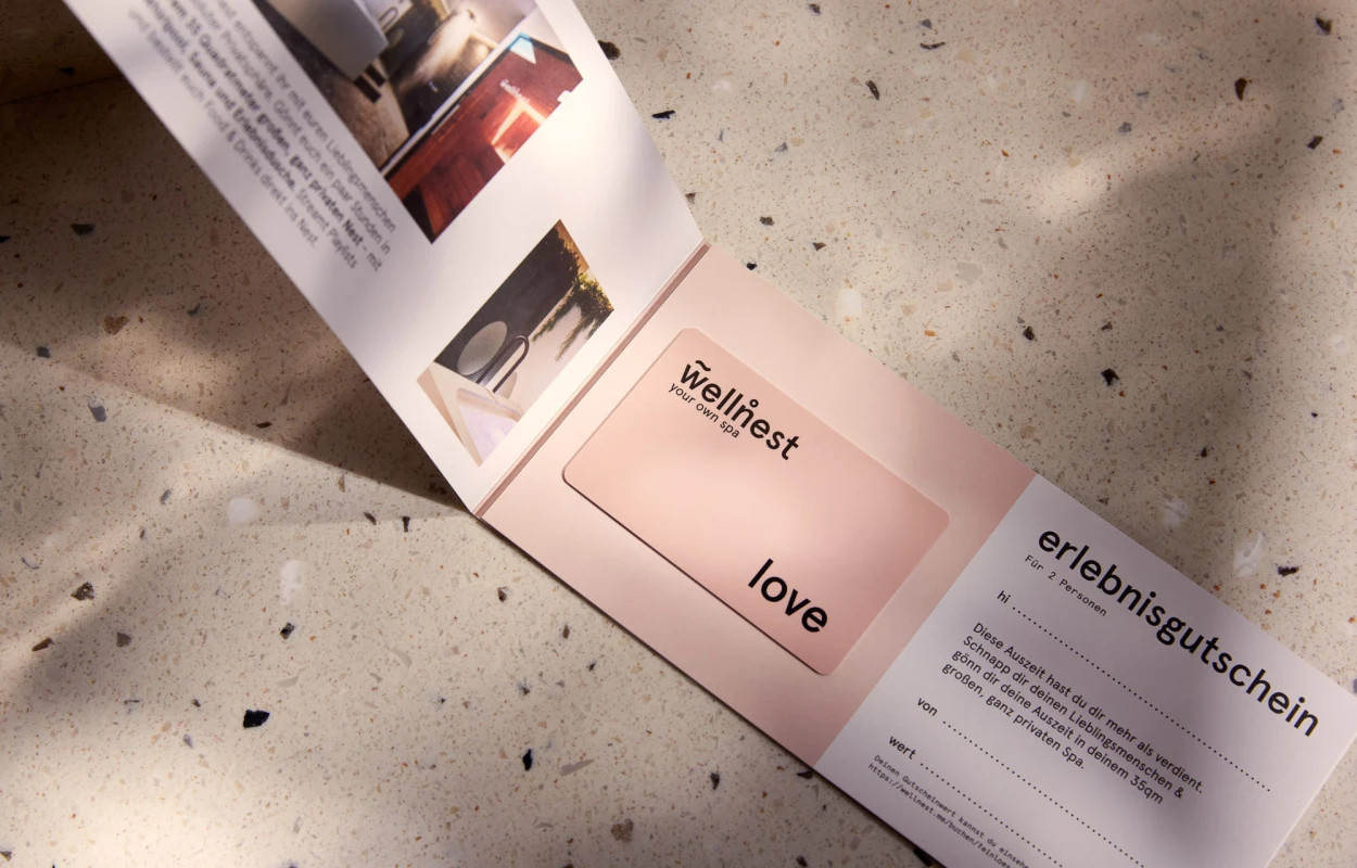 Schenkt euch Liebe - Mit diesem Erlebnisgutschein für eine Auszeit im love-vibe schenkst du deinen Liebsten echte Vorfreude und ein unvergessliches wellnest-Erlebnis mit Kerzenlicht, Sekt & vielem mehr. Mit unserem Erlebnisgutschein kann der oder die Beschenkte auf wellnest.me und in allen wellnest Filialen sein Nest buchen. Du kannst zwischen einer Geschenkkarte und einem digitalen Gutschein (als PDF per E-Mail) wählen.