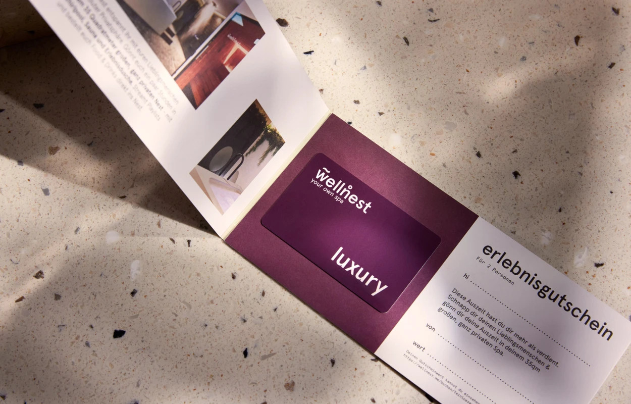 Mit unserem Erlebnisgutschein kann der oder die Beschenkte auf wellnest.me und in allen wellnest Filialen sein Nest buchen.